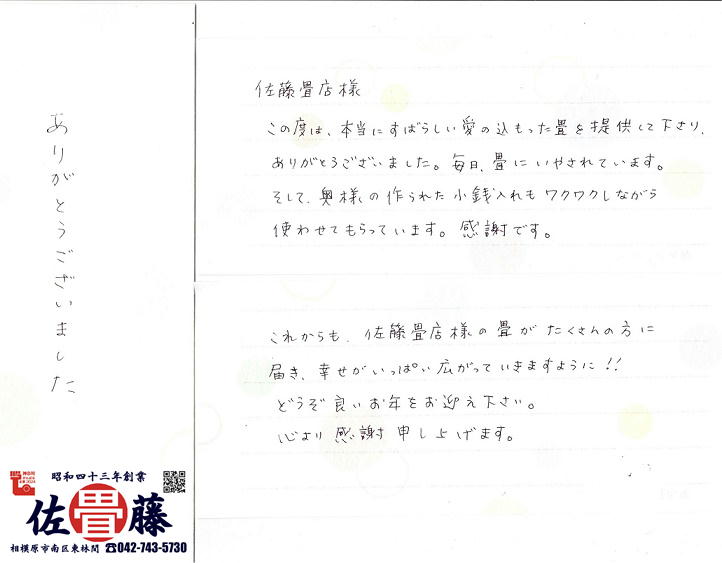 佐藤畳店さんの細かな、あたたかい気持ちに感謝していいます。とてもていねいすぎるくらいの作業していただきました。次回も頼もうと思っています。