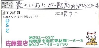 佐藤畳店:この度はお世話になりました。1部屋だけですが家の中どこにいても、イ草の香りがして癒されます。さすが国産ですね。