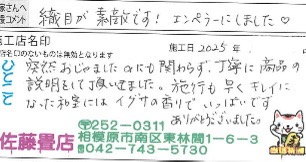 佐藤畳店さんの細かな、あたたかい気持ちに感謝していいます。とてもていねいすぎるくらいの作業していただきました。次回も頼もうと思っています。